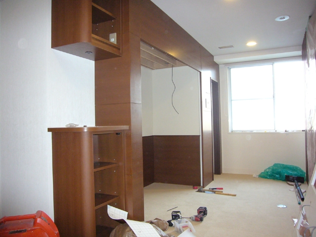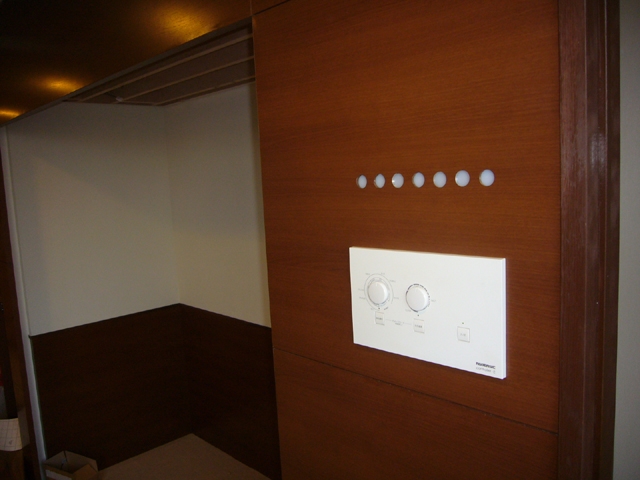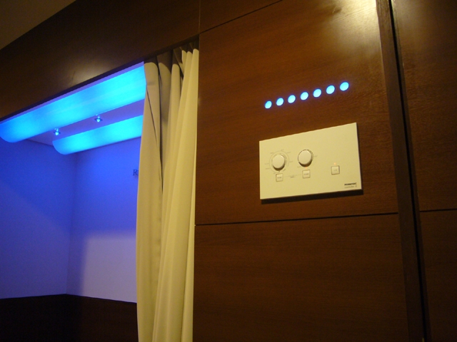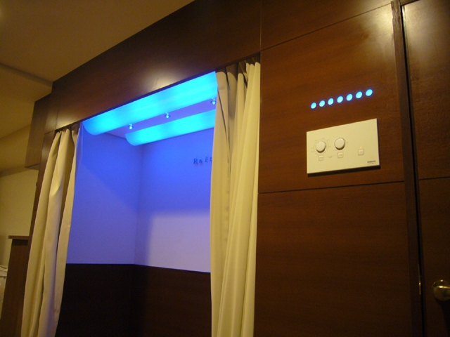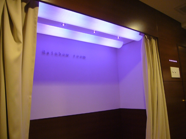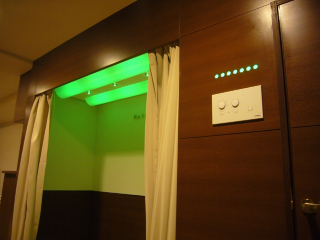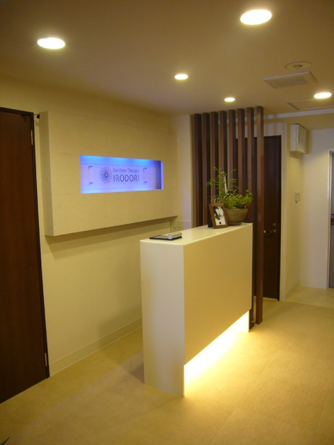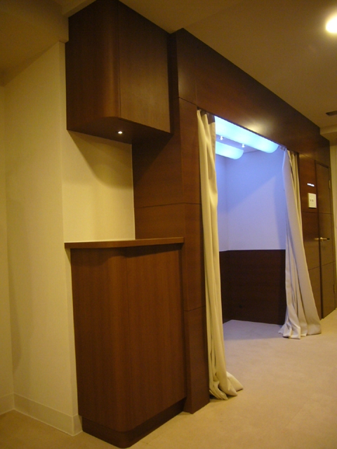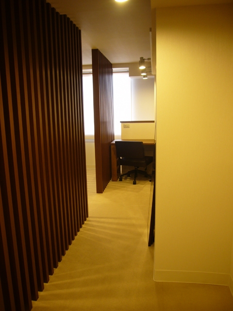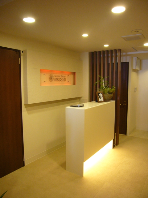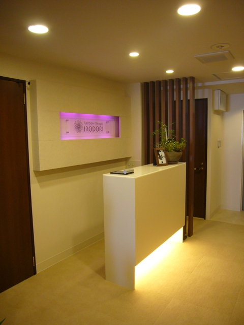 リラクゼーションサロンということで落ち着いた雰囲気を感じさせる空間に仕上げました。 京都では細長な間取りになりがちですが、間仕切りに縦格子をふんだんに使うことにより、もとの空間を維持しながら広さを確保しました。 また、エコロジーを考慮して照明器具には蛍光灯ダウンライトやLEDを採用しています。