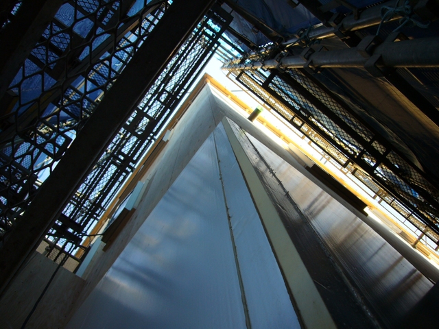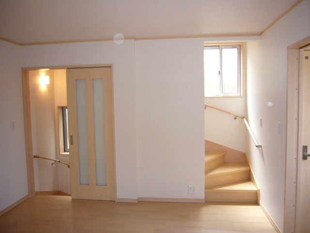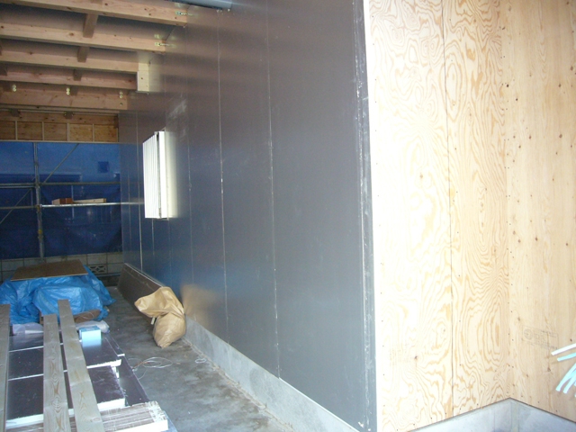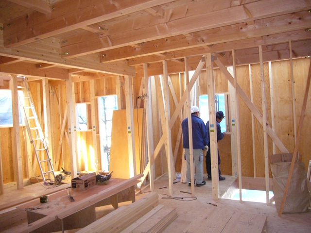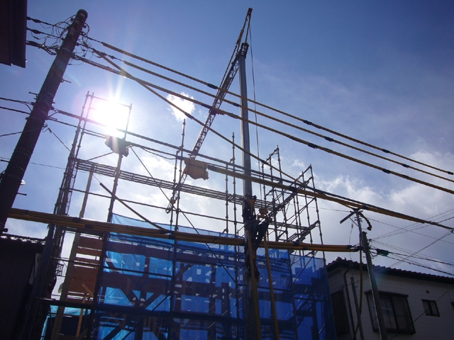 木造3階建の2世帯住宅です。限られた敷地の中で、建ぺい、容積率の許す限りめいいっぱいで計画しました。外張り断熱工法です。